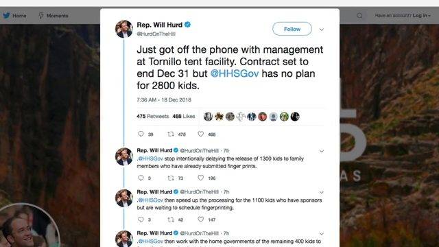 U.S. Rep. Will Hurd sent out a series of tweets to the Department of Health and Human Services, saying, "Just got off the phone with management at Tornillo tent facility. Contract set to end Dec 31 but @HHSGov has no plan for 2800 kids.”