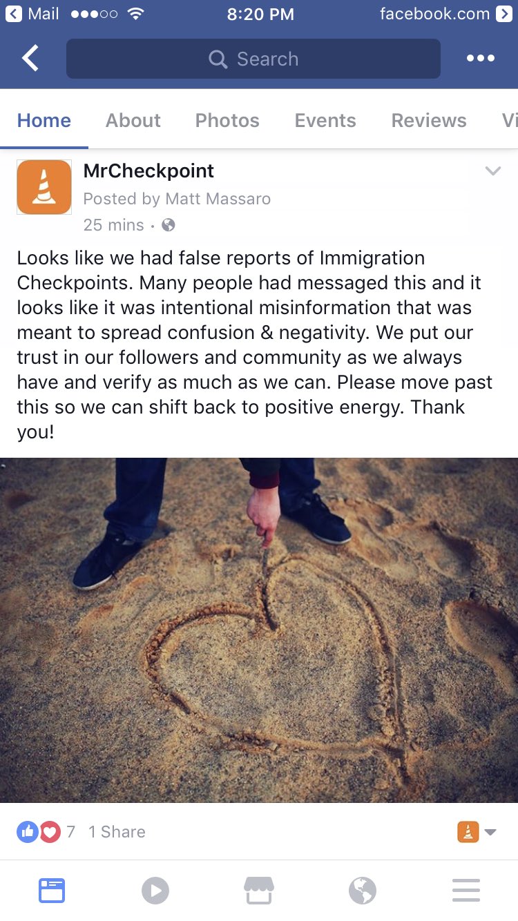 We received several reports of an immigration checkpoint that were found to not have occurred. Deleting that tweet and will keep you posted.