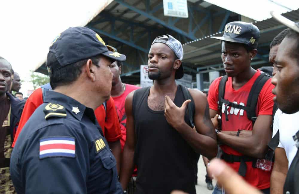 A group of migrants without permission to enter Costa Rica speak with a police officer at the Paso Canoas border checkpoint on April 13, 2016.