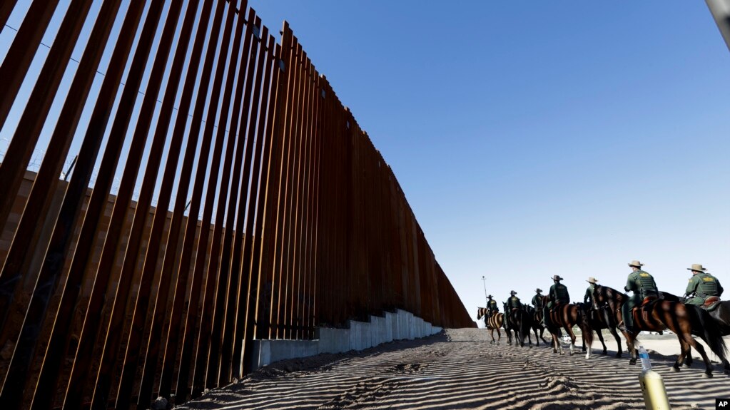 FILE - Mounted Border Patrol agents ride along a newly fortified border wall structure in Calexico, California, Oct. 26, 2018.