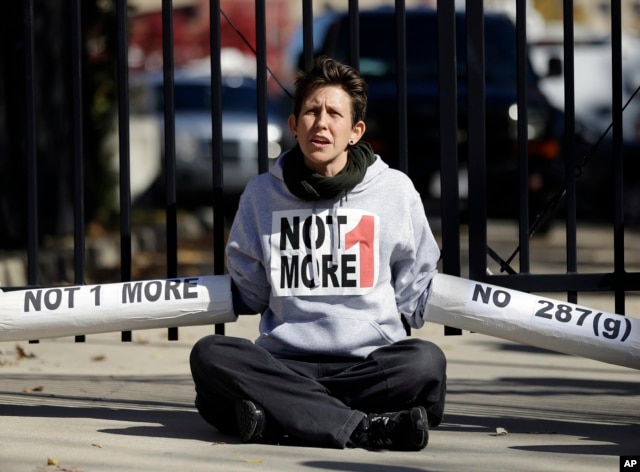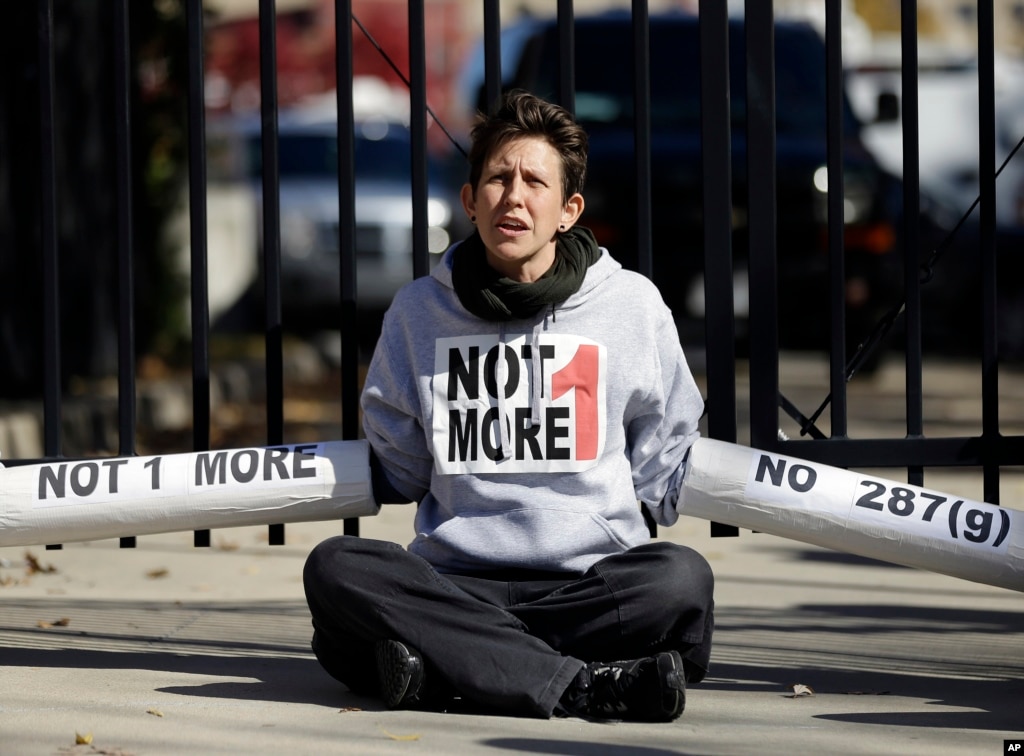 FILE - An Immigration activist, protesting deportations of people who are in the country illegally, blocks the front
