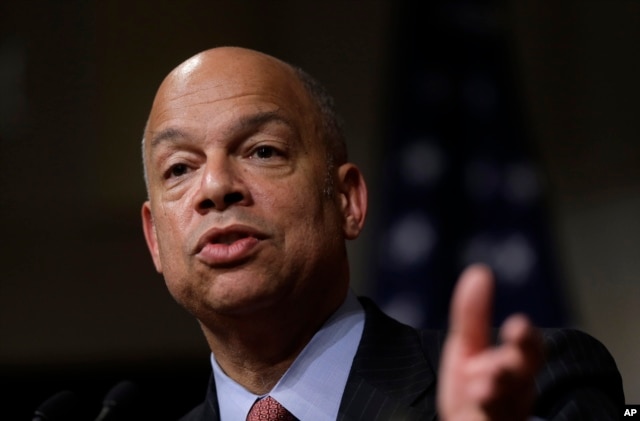 Homeland Security Secretary Jeh Johnson addresses an audience during a forum at John F. Kennedy School