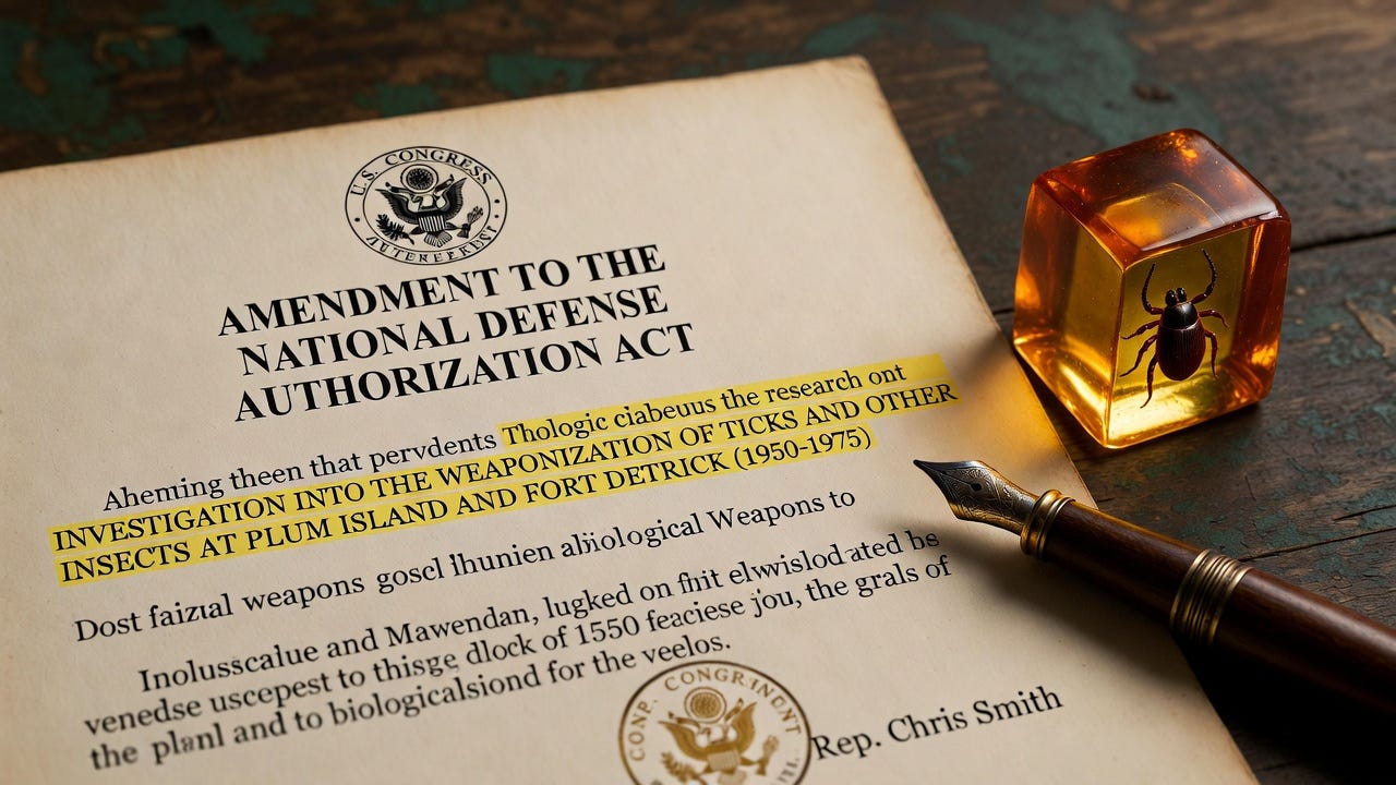 The amendment cited evidence that both Plum Island and Fort Detrick had been busy injecting these little bloodsuckers with all sorts of nasty pathogens.