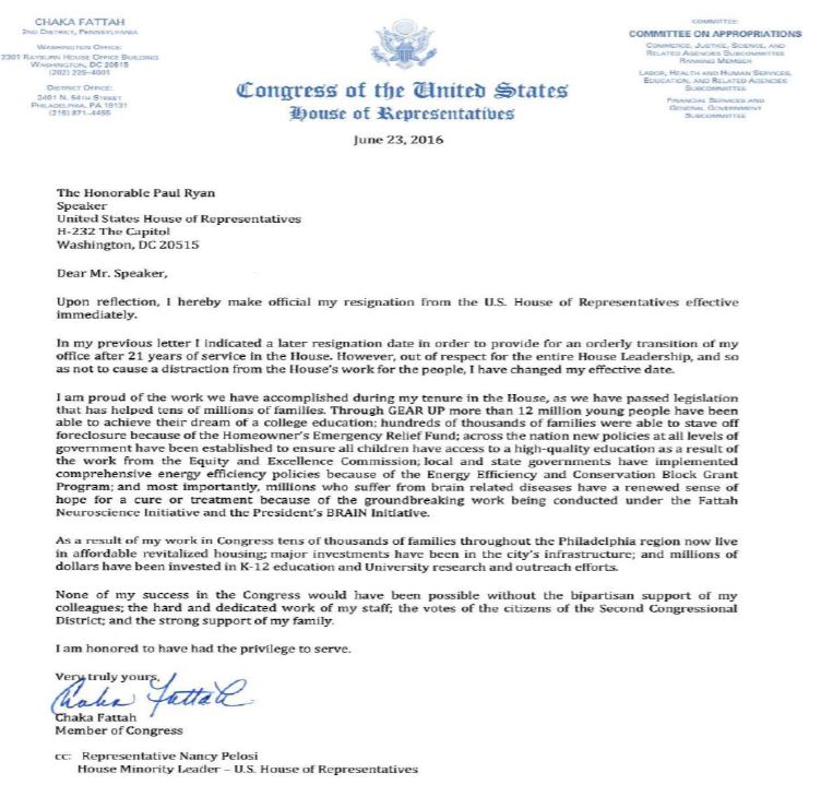 Rep. Chaka Fattah (D-Pa.) is resigning effective immediately, he announced Thursday, after initially seeking to remain in Congress despite his conviction on corruption charges.