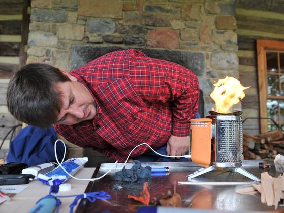 Scott Hunt shows how to build a fire in a small BioLIte stove which he is using to charge a cellular phone,. The stove converts heat from the fire into usable electricity.(Photo: By Tim Loehrke, USA TODAY)
