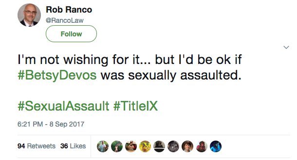 “I’m not wishing for it… but I’d be ok if #BetsyDevos was sexually assaulted,” Mr. Ranco said in a tweet on Friday evening.