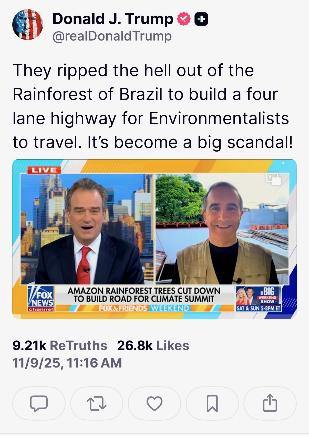 Trump posts on Truth Social with an embedded video of Morano’s Fox & Friends segment live from Brazil at COP30 about cutting down Amazon rainforest for 4-lane highway – AKA Clear-Cut30