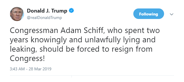 85) POTUS believes Adam Schiff should be forced to resign from Congress for [knowingly] lying and leaking classified information. https://twitter.com/realDonaldTrump/status/1111217169730338816 …