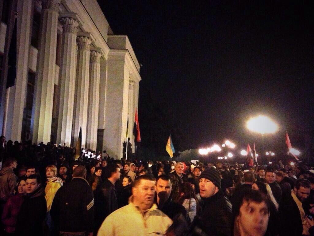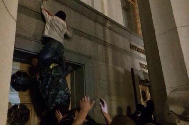 Around 2,000 members of the neofascist organization converged on the Verkhovna Rada Thursday evening and smashed glass door panes of the government building. The Russian state news agency RIA Novosti reported parliament MPs had escaped through an underground tunnel. Security forces prepared to disperse the demonstration with water cannons, according to the Russian news network RT.