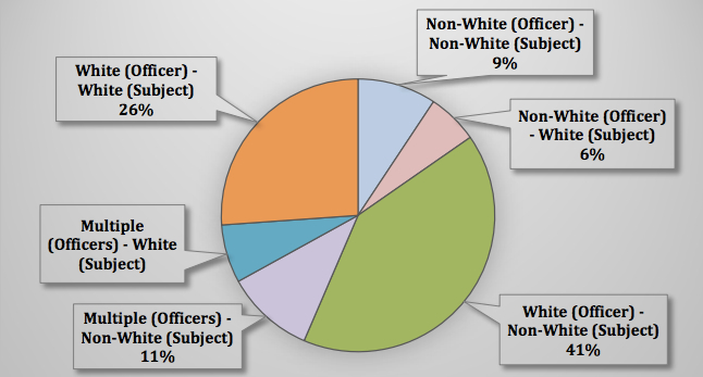 The study also sorted 335 cases in the county where the race of the officer and the subject was known. In 41 percent of those cases, the officer was white and the person shot was non-white. In 26 percent of the cases, both the officer and subject were white.
