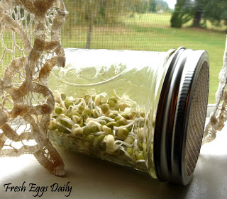 I've been trying to think of inexpensive, healthy treats for them since now with more than thirty chickens and ducks, it's just too expensive to buy them produce at the grocery store like I used to do when we only had eight. Turns out, sprouts are extremely nutritious and easy to grow.