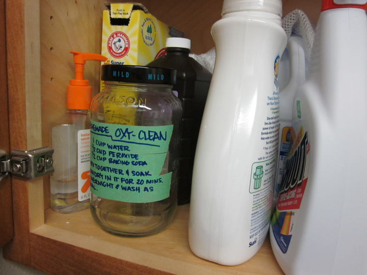 After I rinsed out the jar, (the baking soda leaves it a little gritty) this is how I store the empty jar in my laundry cabinet. That way I always have the recipe and a container to shake it in close at hand.