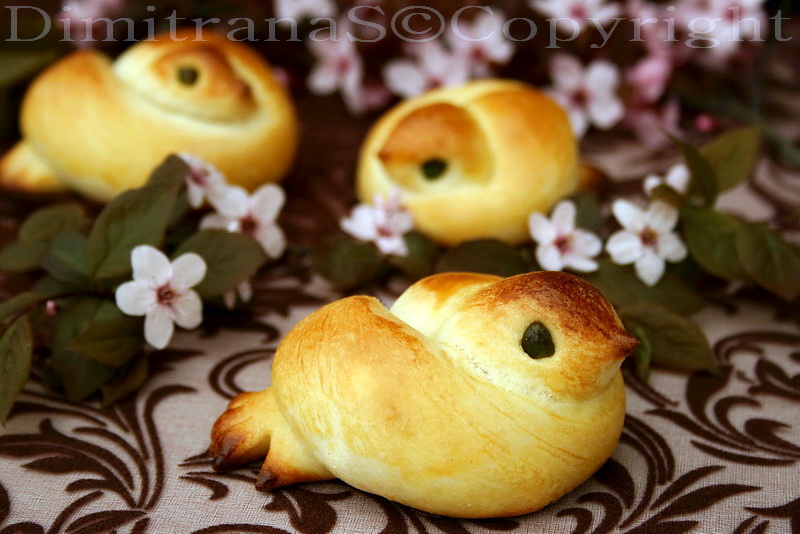 Yeast diluted in fresh, slightly pozatopleno milk.Sift the flour, making him Kladentche it is poured sugar, pinch of salt, soft butter (room temperature, chopped into pieces) and knead the dough, which is left covered for half an hour.Then tear the dough balls weighing about 70 grams., Rolled a fitilcheta and each tied together: on one end is shaped beak and eyes of the other cars make 4-5 incisions and bird shaped tail.Smeared with yolk lining in tray covered with cooking paper and bake a mean grilled, 200-220 ° C until ready.