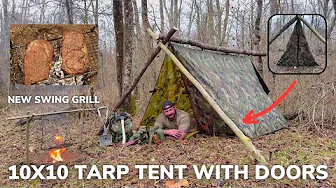 Solo Overnight Building a Waterproof Tarp Tent with Closing Doors in the Rain and Ribeye Steaks