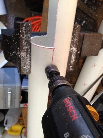 I used a hole saw to drill the center holes for the PVC post. The center post has caps on the ends to secure to the threaded rod.
