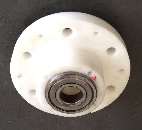 This may be the most difficult part. You need to design a hub that will space the coils in line with the magnets, and also have some sturdy bearings at each end. I started out with a block of plastic used for an automotive brake rotor holding fixture. You could make the same on a lathe, or build one up from layers of wood or other plastic, etc.
