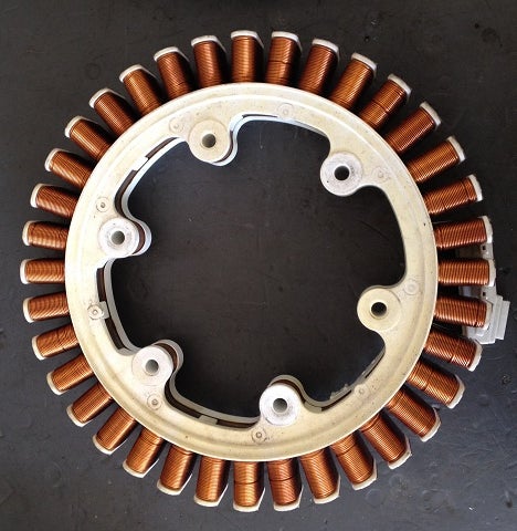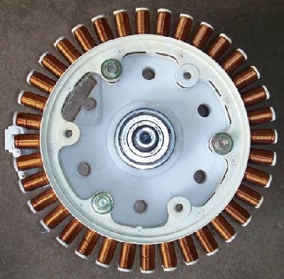 Here is the hub bolted to the coils with a cutout for some wiring. At this point, I haven't rewired any of the coils. There are many DIY generator projects on the web using these same washing machine motors and some describe various ways to rewire them for different voltages and currents. Your application will define your wiring.