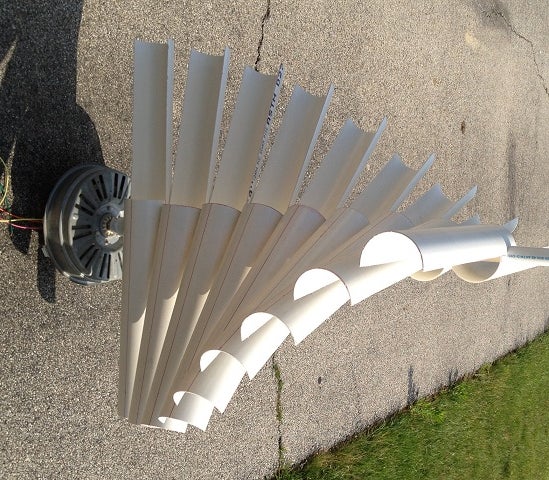 My blade design is based on some vertical blades I've seen, and in particular, a spinning porch ornament I purchased a few years back. The Idea is to have a cup-like section of the blade always in the direct flow of the wind.