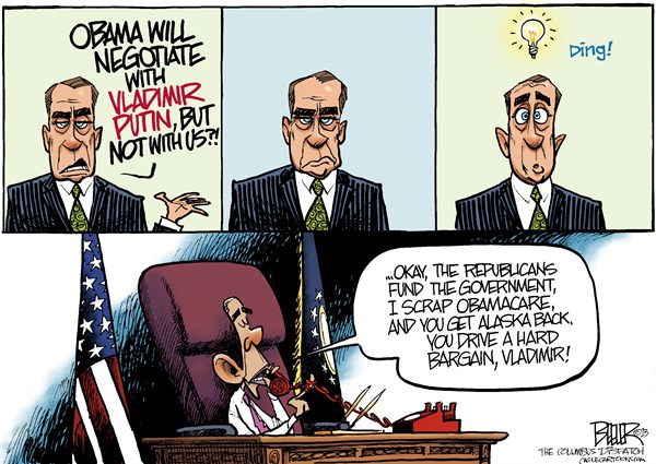 Inspired by Texas Republican Ted Cruz, whose recent filibustering famously included a reading of Dr. Seuss and a comparison of the congressional challenge to that of Britain facing the Nazis, this cartoonish vision of Washington dysfunction boils down to a bunch of obstinate, constitutionally obsessed libertarians in tricorn hats leading the GOP elephant by the trunk over the cliff edge, leaving the Democrat donkey looking statesmanlike in comparison.