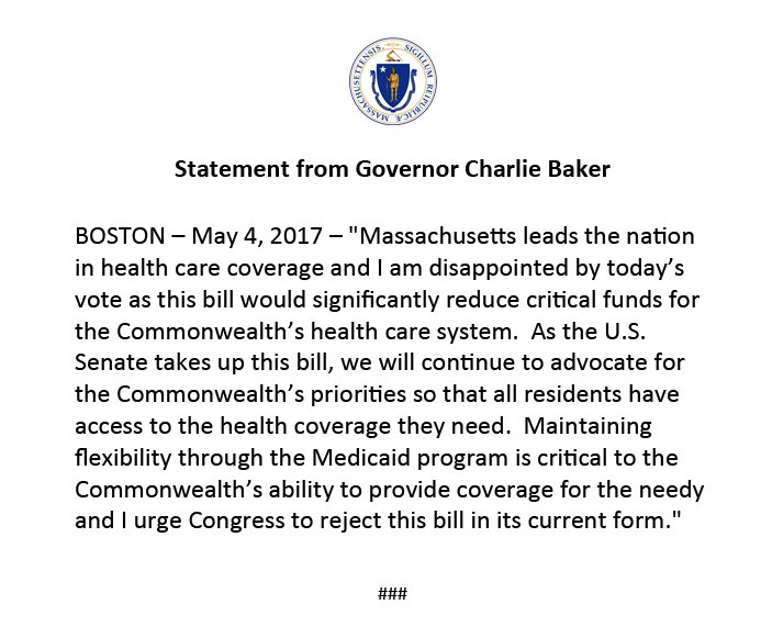 Governor Baker's statement on the passage of the American Health Care Act by the U.S. House of Representatives.