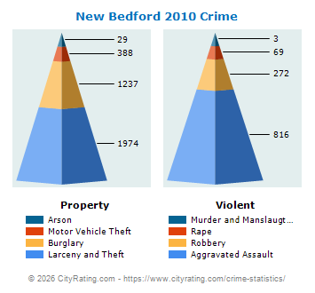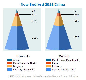 In 2010 the city violent crime rate in New Bedford was higher than the violent crime rate in Massachusetts by 177.41% and the city property crime rate in New Bedford was higher than the property crime rate in Massachusetts by 70.86%.